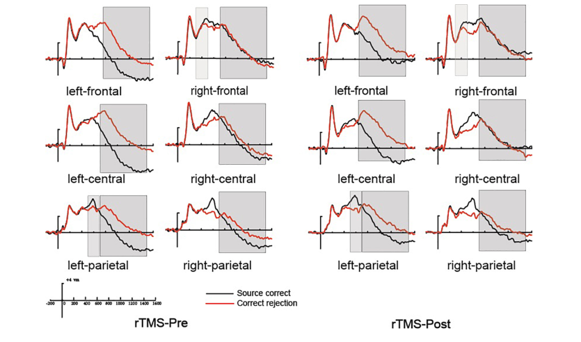大脑区域在(a)双侧前扣带回(BA32),(b)左额中回(BA 10)和(c)左额中回2 (BA 9/46)的激活中显示出显著的组间(tDCS组vs假刺激组)×测试时间(前测vs后测)交互作用,柱状图为大脑激活beta 值 以往研究发现,老年人即使能够做到记忆成绩和年轻人相当,但是在神经活动层面往往还是可以观察到年龄差异,即老年人动用了补偿机制。比如事件相关电位研究发现,在记忆提取阶段存在典型的“新旧效应”(能够正确提取的旧项目比新项目诱发更大的正走向的波幅),老年人除了和青年人有共同的顶叶新旧效应,还通常存在仅在老年人出现的晚期后部翻转的新旧效应。 tDCS研究发现脑刺激能够通过提升提取阶段神经活动水平来改善老年人的记忆成绩,但是尚不能回答这种神经的可塑性是进一步增强了老年人特有的补偿机制,还是使得老年人和年轻人共同的神经活动得到了增强,换言之,脑刺激可以诱发老年人定量还是定性的神经可塑性变化? 为了回答这个问题,李娟研究组开展了一项rTMS干预研究。基于随机控制设计,对实验组健康老年人的右半球背外侧前额叶(rDLPFC)施加10 Hz的为期两周总共10次的rTMS干预,对照组的健康老年人则接受假刺激。干预前后,研究者让老年人进行来源记忆任务,同时记录EEG。结果发现,rTMS改善了健康老年人的来源记忆成绩。更为有趣的是,老年人特有的回想成分——晚期后部翻转的新旧效应并没有出现rTMS组与对照组的差异,但年轻人依赖的回想成分——左侧顶叶新旧效应在rTMS组表现出选择性提高(见图2-3),这说明rTMS使得老年人的记忆提取过程更加“年轻化”,也就提示脑刺激是可以诱发老年人定性的神经可塑性变化。